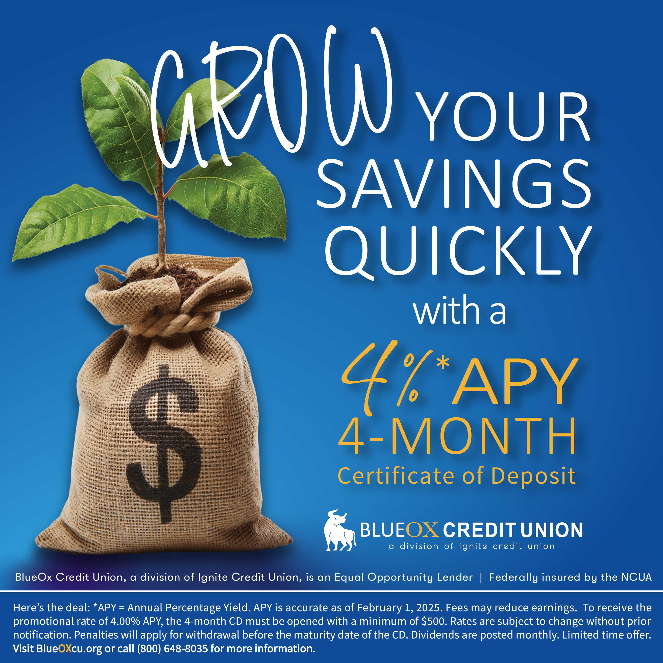 Earn 4.00% APY** on a 4-month Certificate of Deposit at BlueOx Credit Union! Whether you're saving for something special or simply looking to grow your money a bit faster, this is a great opportunity to get started.