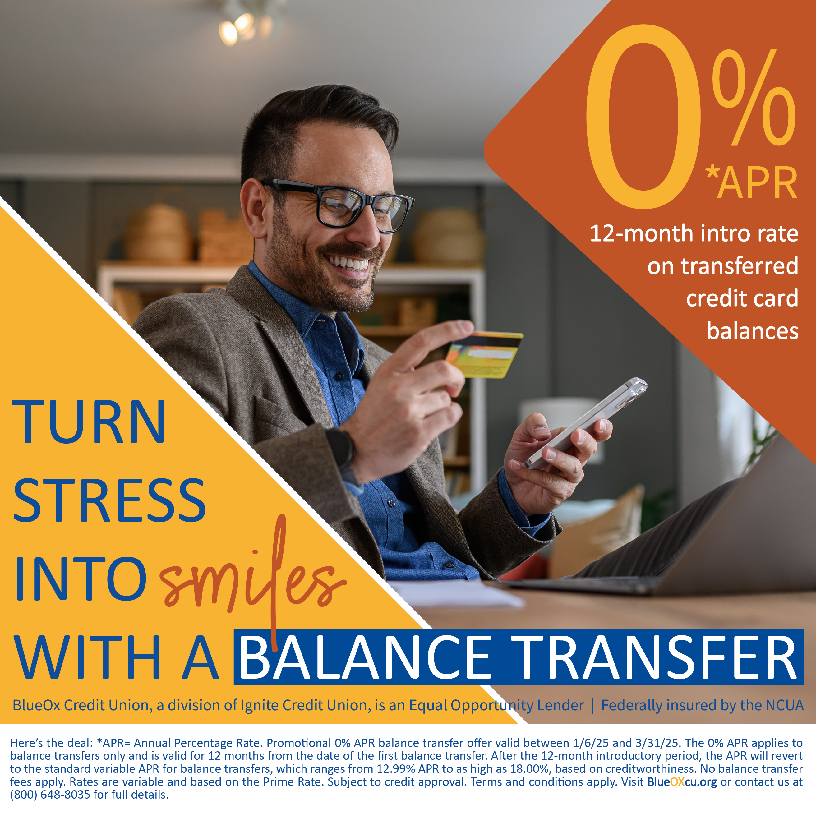 *APR= Annual Percentage Rate. Promotional 0% APR balance transfer offer valid between 1/6/25 and 3/31/25. The 0% APR applies to balance transfers only and is valid for 12 months from the date of the first balance transfer. After the 12-month introductory period, the APR will revert to the standard variable APR for balance transfers, which ranges from 12.99% APR to as high as 17.50%, based on creditworthiness. No balance transfer fees apply. Rates are variable and based on the Prime Rate. Subject to credit approval. Terms and conditions apply. Visit BlueOXcu.org or contact us at (800) 648-8035 for full details.
